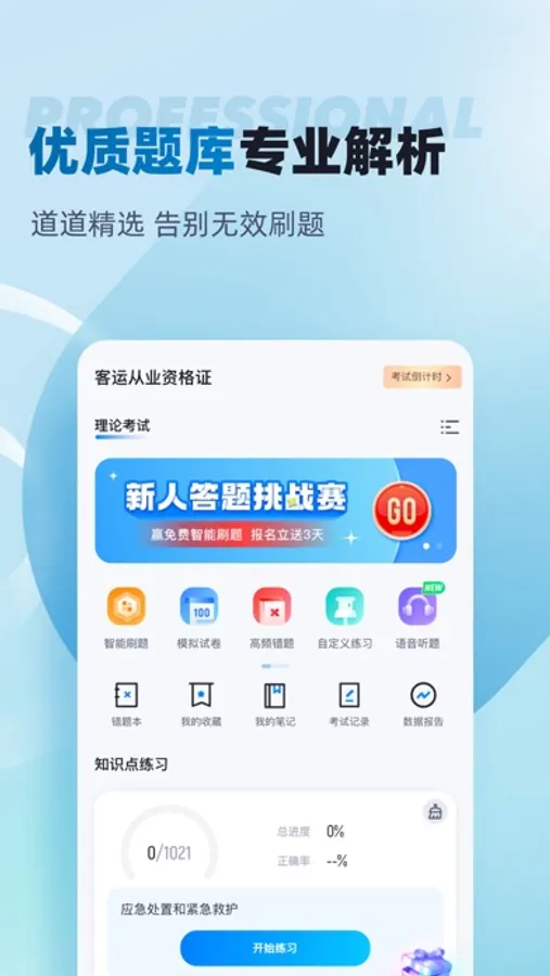 客运从业资格题库内含考点练习,全国通用卷以及地区卷模拟练习,以及按照固定考试比重的随机式的抽题的真题考场,成绩单实时记录考试数据,一点一滴的反馈考生近期学习状态以及自我正确率的提升,大大的给予考生通过考试的信心。