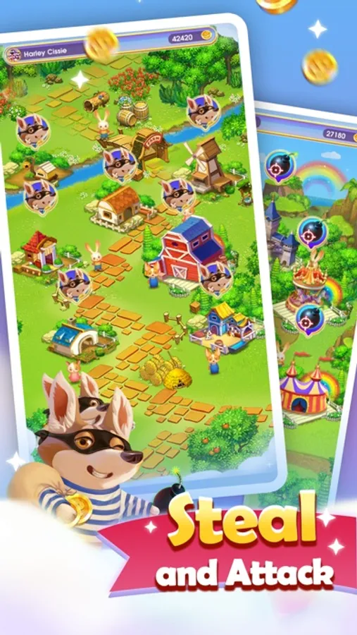 - Attack others' manors by getting bombs from coin pusher, and grab a lot of coins.