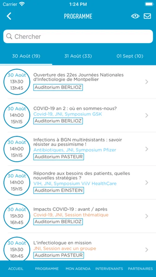 - retrouver le programme de chaque journée heure par heure (salles, sessions, thèmes, orateurs, résumés,…) et à chaque instant consulter le programme en cours