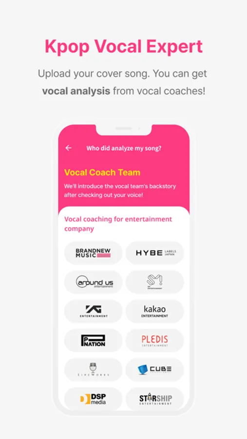 Upload your cover song! The vocal coaches from major kpop agencies such as HYBE, SM, JYP, and YG directly analyze the user’s songs and give you the details. All users can see their voice type, identical type idol, vocal level, and kpop group position through the analysis results.
