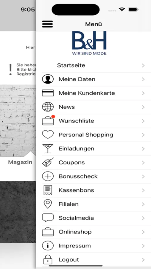 Mit der B&H App verpassen Sie keine Einladung zu unseren exklusiven Kundenevents und profitieren von individuellen und außergewöhnlichen Gutscheinen und Deals. Für Ihr persönliches Shoppingerlebnis können Sie bequem über die App einen Termin mit Ihrem Modeberater abstimmen und zudem noch Ihre persönlichen Styles festlegen - so können Sie sich noch entspannter inspirieren lassen! Sämtliche Prospekte finden Sie in der B&H als blätterbares e-Paper und für ein spontanes Shoppingerlebnis leiten wir Sie einfach in unseren Onlineshop weiter.