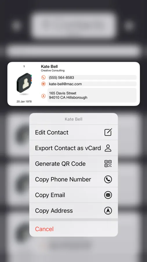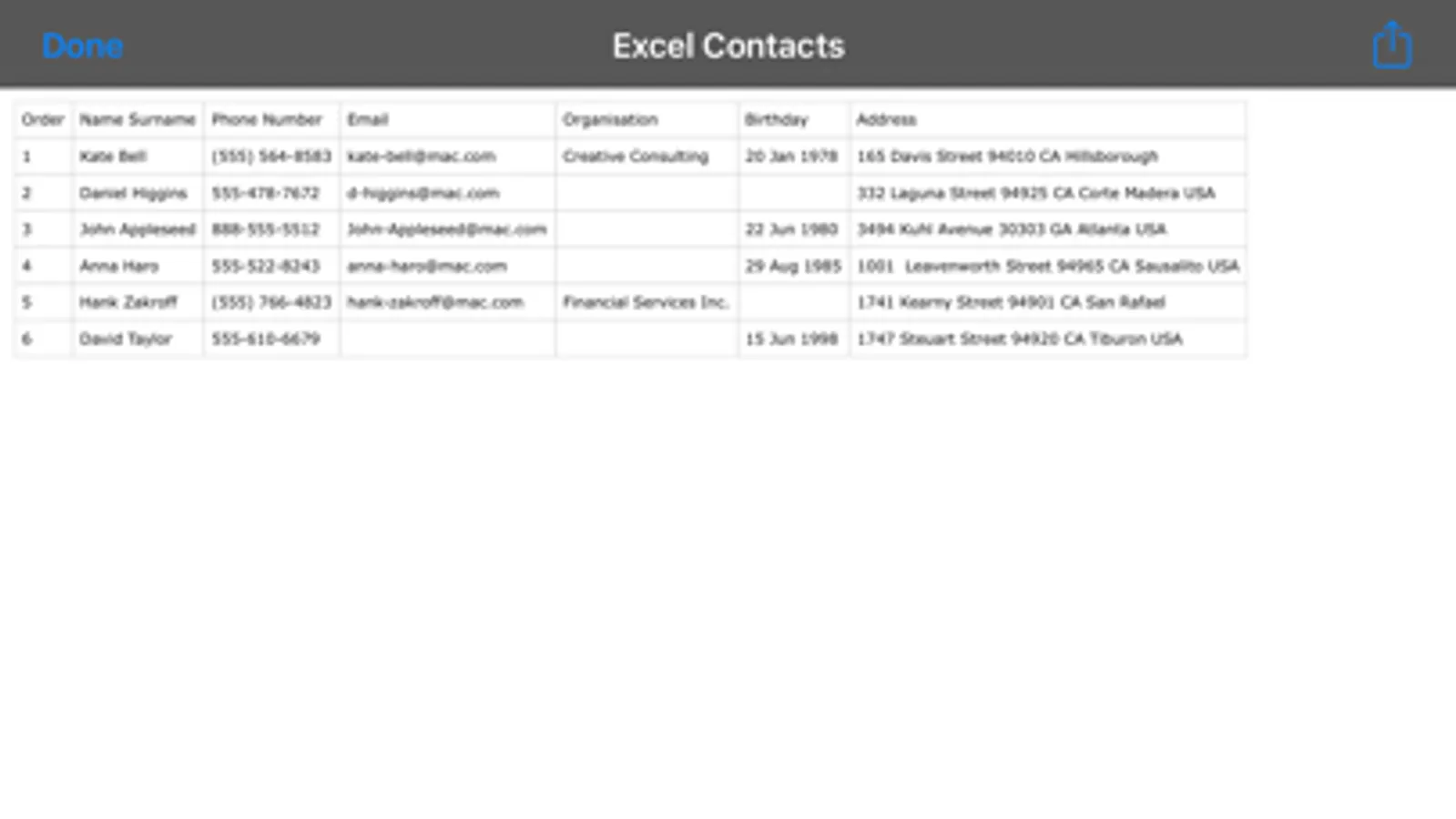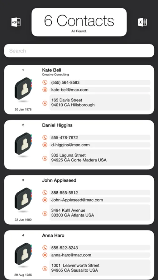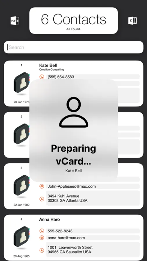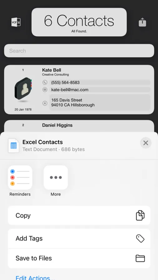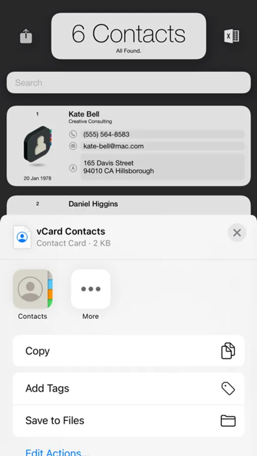• Easy restore! Just send the saved *.vcf backup file to Apple’s Contacts app and it will import it. There's no need to use a dedicated app to restore vCard backups.
