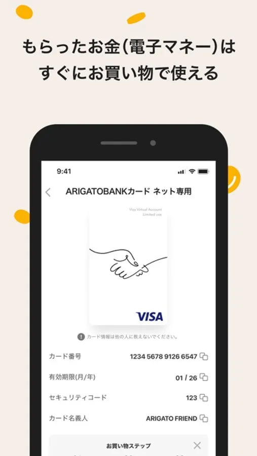 もらったお金は、世界中のVisa加盟店ですぐにお買い物に使えます。使いみちに迷ったら、アプリ内で支援プロジェクトを選んでお金を送ることで、誰かを支援できます。