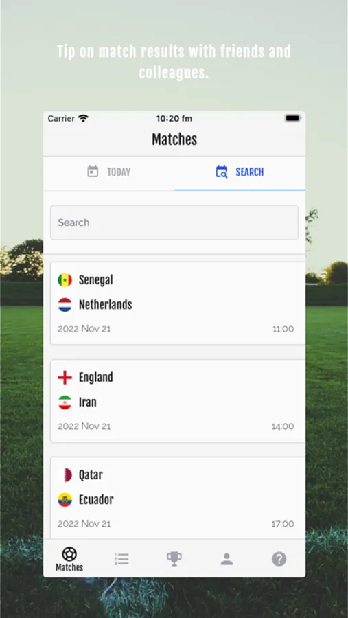 Invite your friends and bet on the results in the Football WC 2023 matches to see who's the best of your friends and colleagues. You can set up your own groups and at the same time compete against all users. You also have the option to bet on which team will end in first, second and third place in the tournament as well as the top scorer.