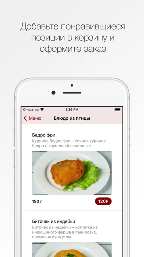 Как сделать заказ в приложении “Ложка-Поварешка”: выберите понравившиеся позиции из меню, добавьте их в корзину и перейдите на экран оформления заказа (по нажатию на иконку корзины).