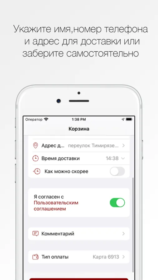 Укажите время, когда хотите прийти за своим заказом или выберите доставку с указанием времени и адреса доставки.