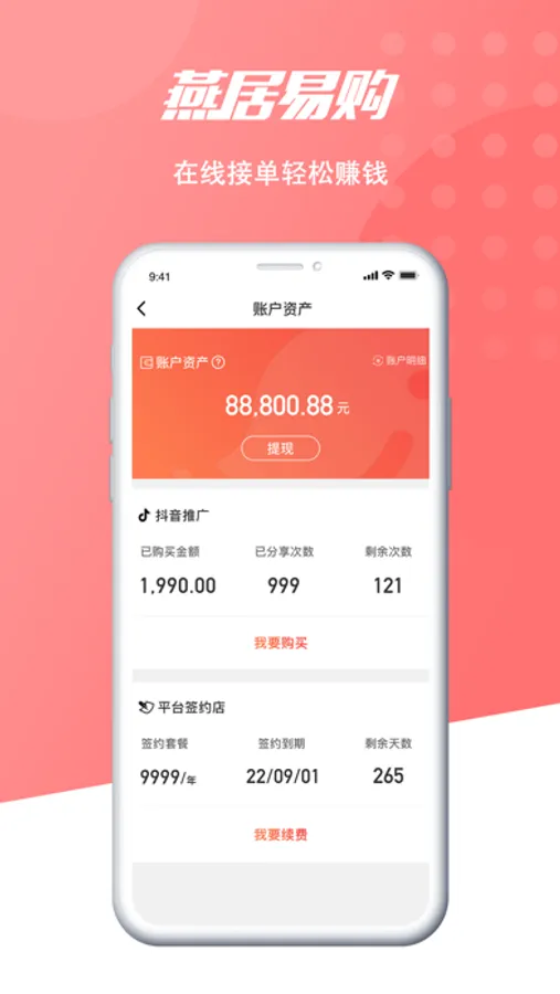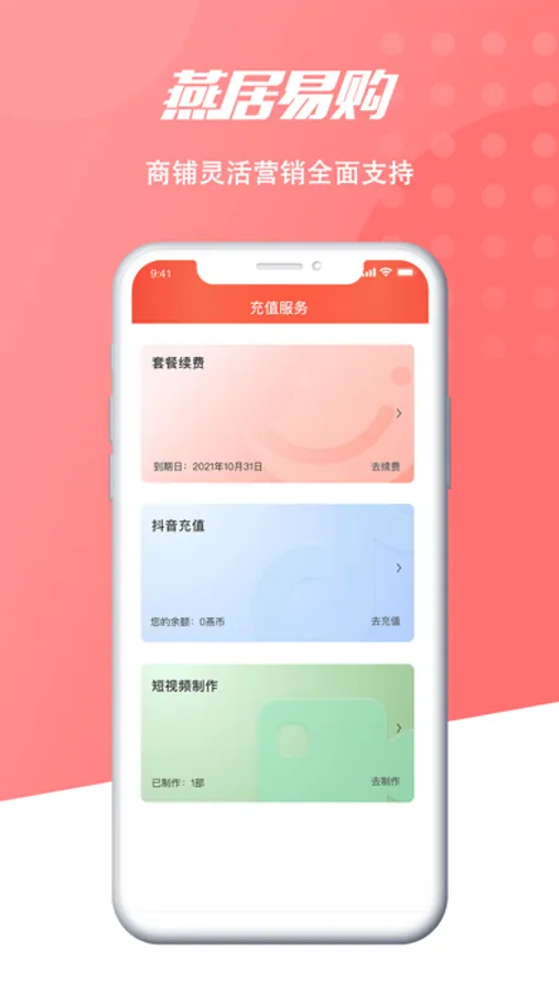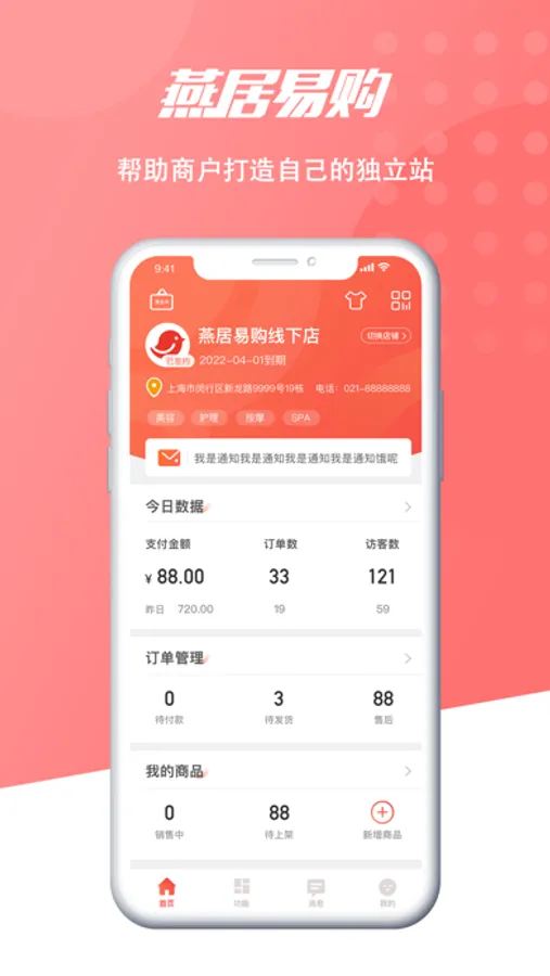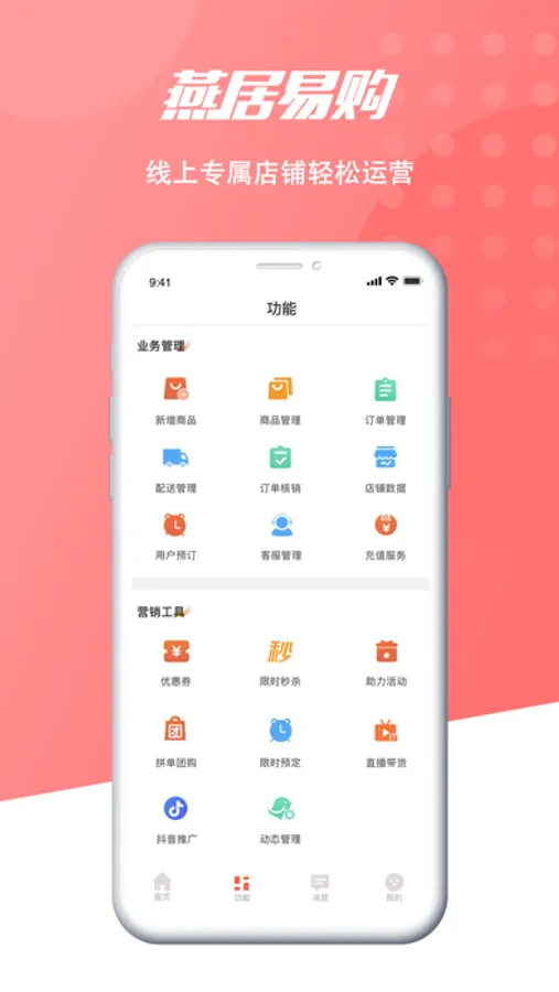 燕居易购商家版,提供给商户开店的所有管理和数据分析,帮助商户可以更加快速精准的服务用户。管理包含商品管理和配送管理等,还有限时抢购等优惠活动的创建。