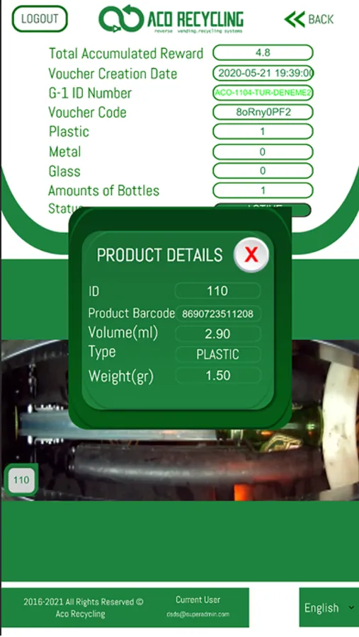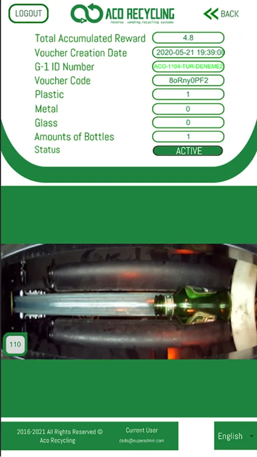 Aco Recycling G-1 Smart Reverse Vending Machine provides full ability to be monitored with it’s real time status anywhere anytime. V3 Monitoring APP enables to control validity & authentication of the vouchers/rewards & provide a total information related to that transaction; including the beverage container photos, total amount of bottles, date & time used within the transaction.