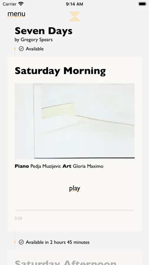 The work is designed as a listening experience that tunes us into the passing of time, connecting us both to the present moment as well as the cycle of the week. The experience invites music to inhabit and structure our everyday — to find us where we are in the world. The morning-afternoon-evening schedule is meant to focus participants on the dawn-to-dusk cycle as well as to create a communal listening ritual. It is also an experiment in large-scale form, designed to draw attention to musical material developing across a week-long expanse, interspersed with vast silences.