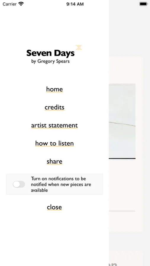 SEVEN DAYS is a work for solo piano in 21 movements, each lasting between three and eight minutes. Listeners are asked to listen to three movements a day according to an approximate schedule — one movement in the morning, one in the afternoon, and another sometime in the evening — for seven days.