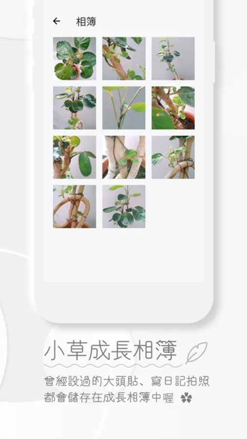 5. 相簿: 依照時間顯示所有大頭貼和日記照片,可以看到植物成長的過程,滿滿的成就感!