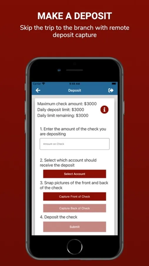 Access is quick, convenient, secure and allows you to do the following from your smartphone or tablet: Make instant account transfers, view account balances, withdrawal funds, deposit checks, pay bills, view your account statements and more with just a few quick taps. Sign-in quickly and securely using facial recognition, fingerprint authentication, and/or a 4-digit passcode.