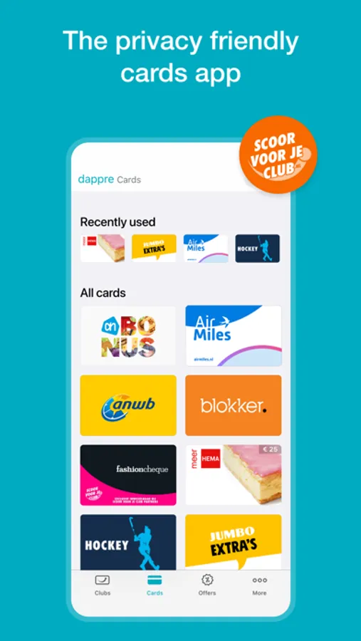 Dappre is the digital cards app that respects your privacy. Convenient, easy to use and without having to create an account! Dappre adds useful information to many cards, such as an overview of connected (web) shops and relevant information and competitive offers.