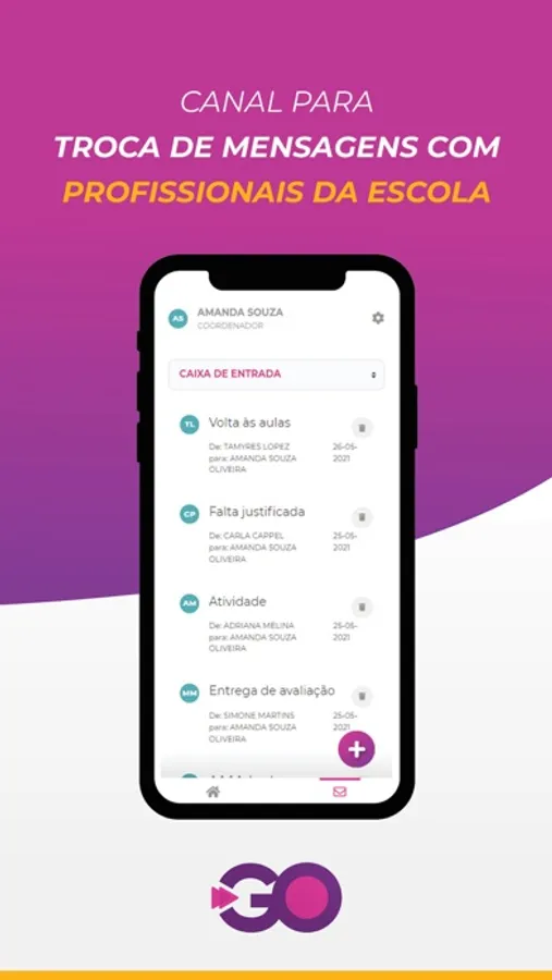 Possibilita ainda a troca de mensagens diretas entre os colaboradores da instituição de ensino - diretores, coordenadores, secretários e professores - com alunos e responsáveis.