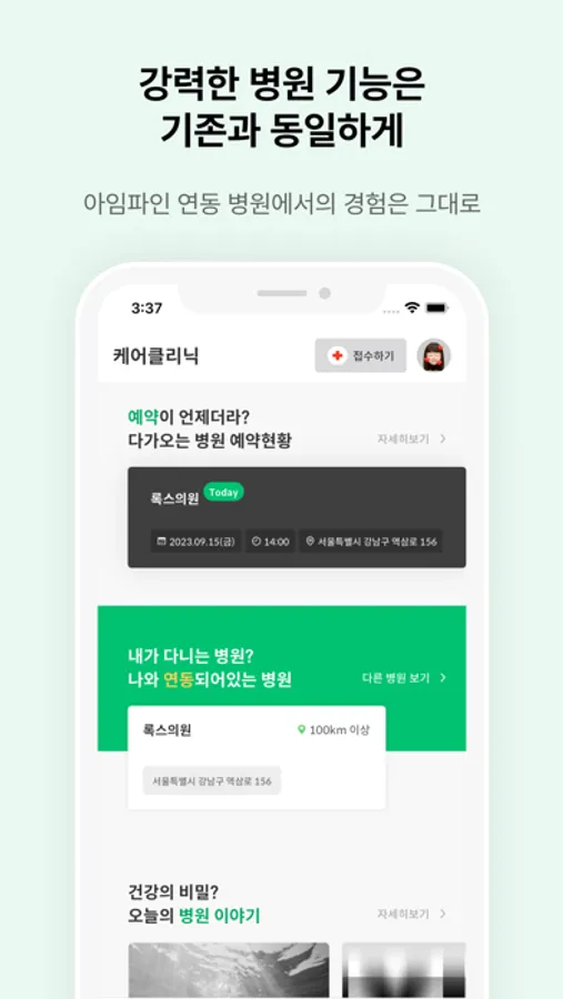 병원 예약, 접수, 진료, 처방, 복약일정 등 강력한 병원연동 기능은 모두 그대로 사용 가능해요.