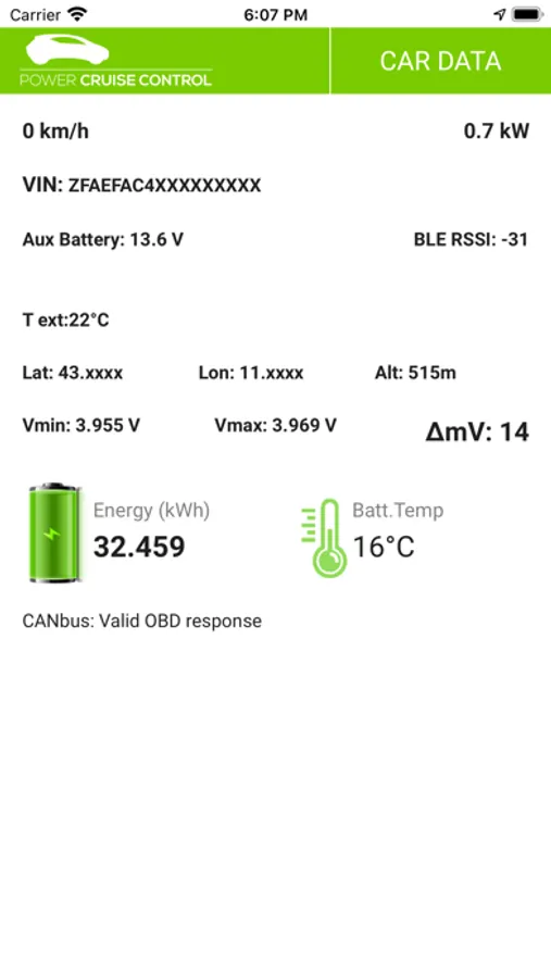 - is real-time connected to the car via a Bluetooth OBDII dongle and knows exactlythe SoC (State of Charge), the SoH (State of Health), the car's speed, instant power, and many other parameters;