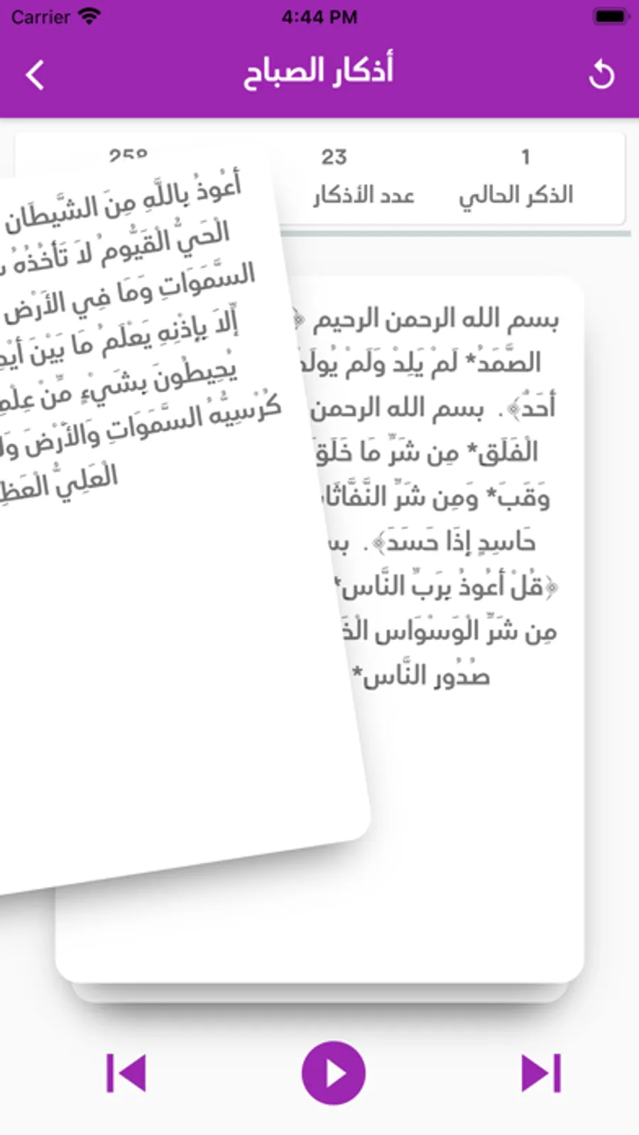 يتم عرض الأذكار بتسلسل بطاقات يستطيع المستخدم التنقل بينها بكل سلاسة