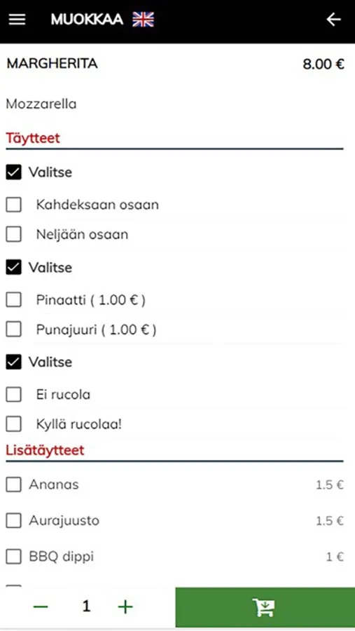 Valittuasi halutun ruoka-annoksen, lisäät sen ostoskoriin – tai valitset esim. lisätäytteitä. Voit tehdä vielä