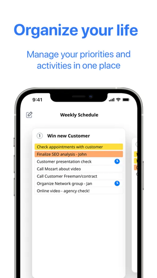 Weekydo helps you to create your weekly schedule like a "cockpit". This gives you an overview of your most important priorities and tasks. With weekydo you will achieve better results on the way to becoming a high performer.