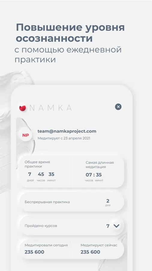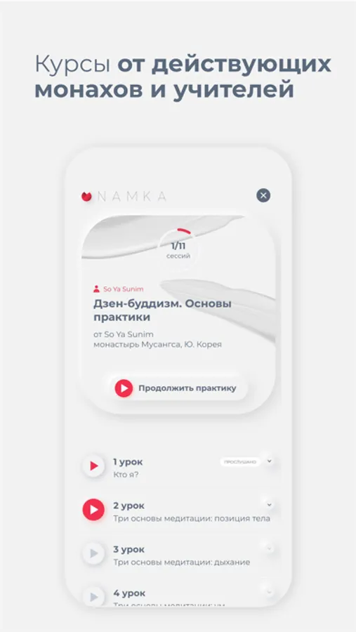 Namka дает возможность развить осознанность и спокойствие ума благодаря практикам медитации. Каждый курс подготовлен монахами и практикующими учителями специально для Namka. Мы не концентрируемся на одной технике — уроки медитации нацелены на углубление в различные духовные практики. Ментальные наставники помогут развить уравновешенный ум, провести сканирование тела, успокоить сознание, научиться техникам дыхания и познать себя. Учителя медитации записывают уроки в естественных условиях — это позволяет приблизиться к состоянию концентрации и осознанности «здесь и сейчас».