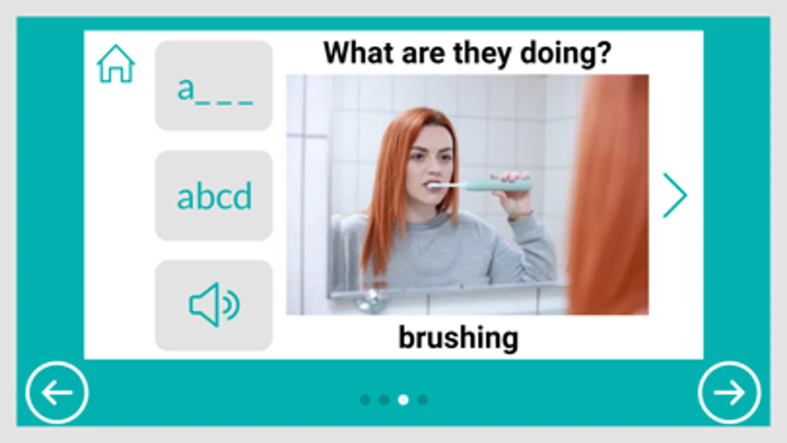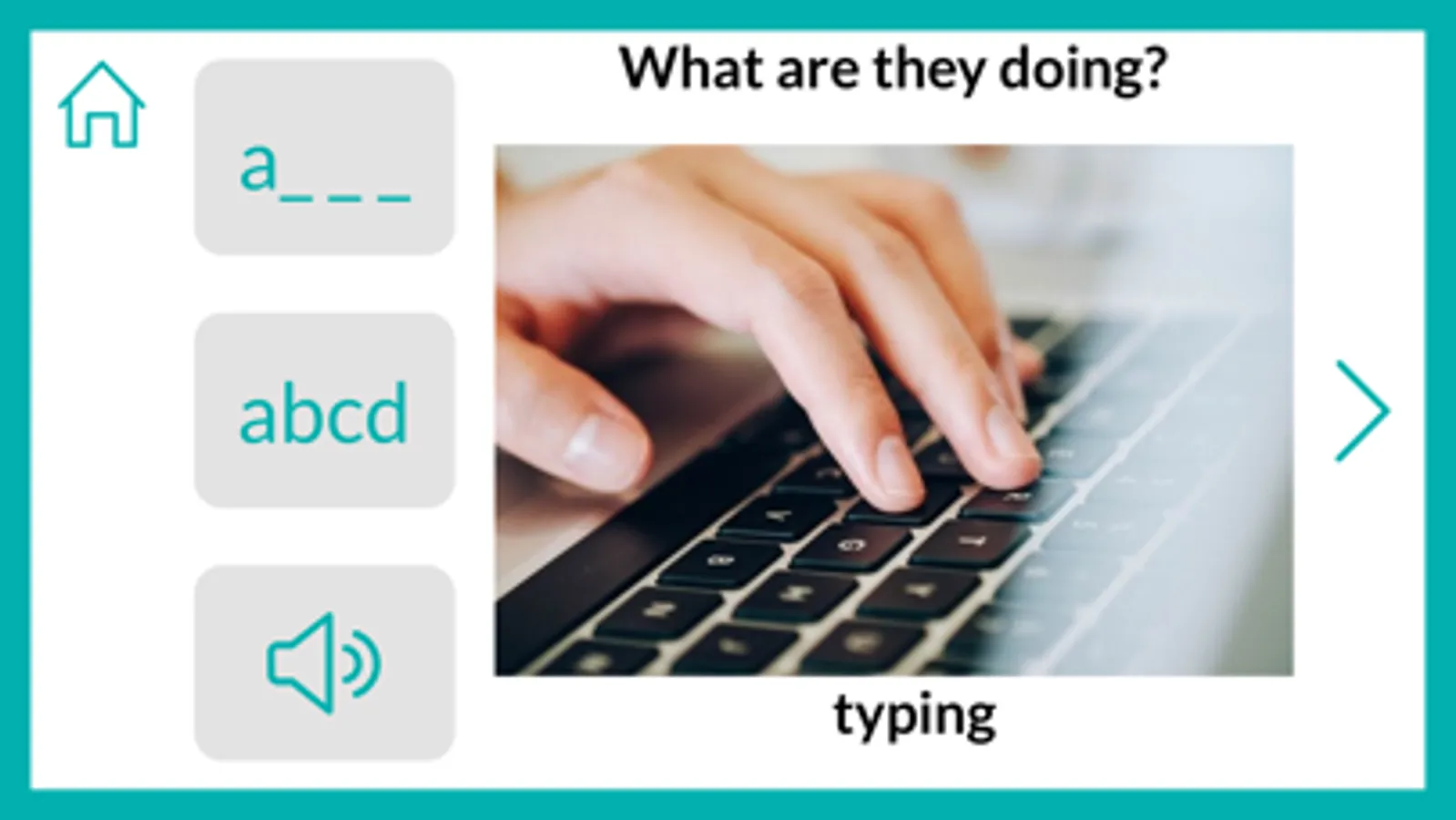 The clear, uncluttered interface is optimized for people with aphasia to successfully navigate the app independently. Letter, word and audio cued assists are readily available as needed for success. The slides are untimed, the audio model can be played repeatedly, and the printed word remains on the screen once revealed.