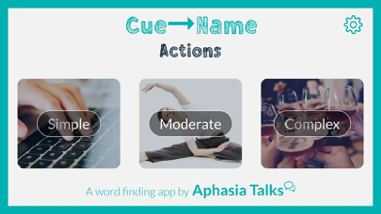 Cue Name (Actions) targets naming skills with a focus on verbs for adults with aphasia, apraxia, and dementia.