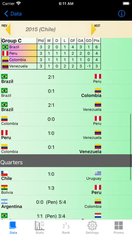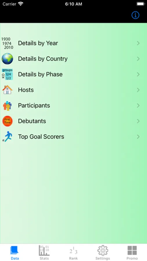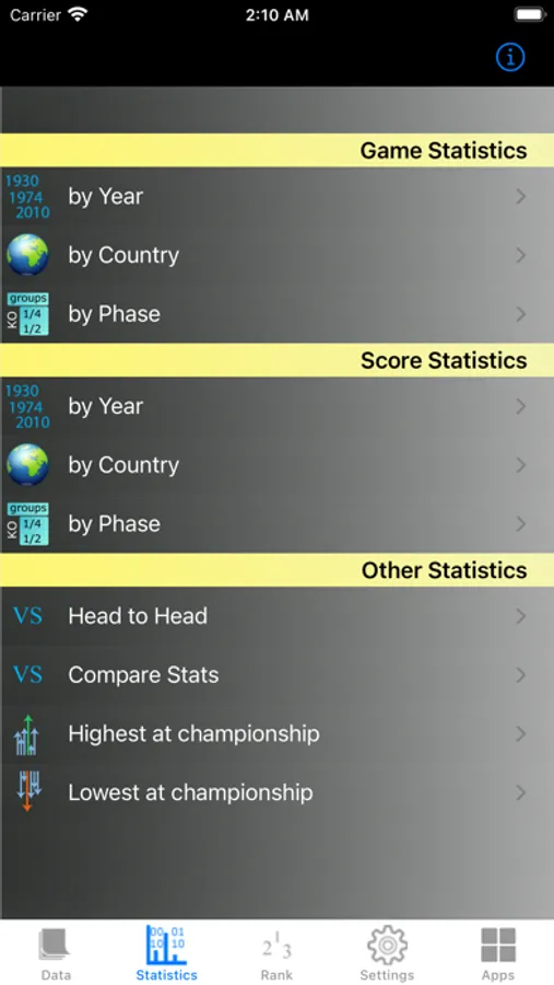 Data is made available by Country, by Year or by Phase of the tournament.