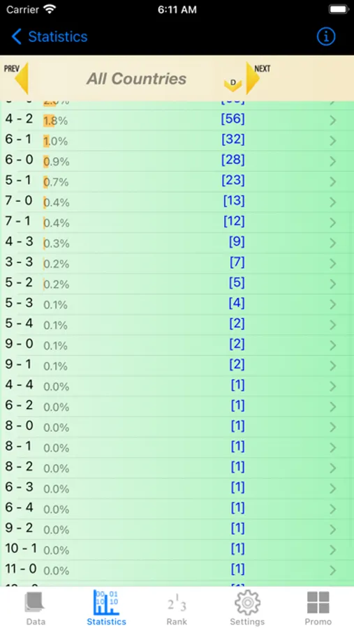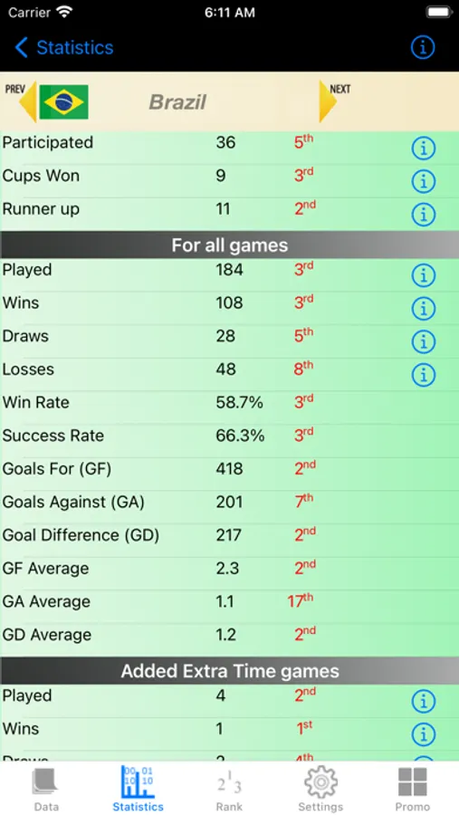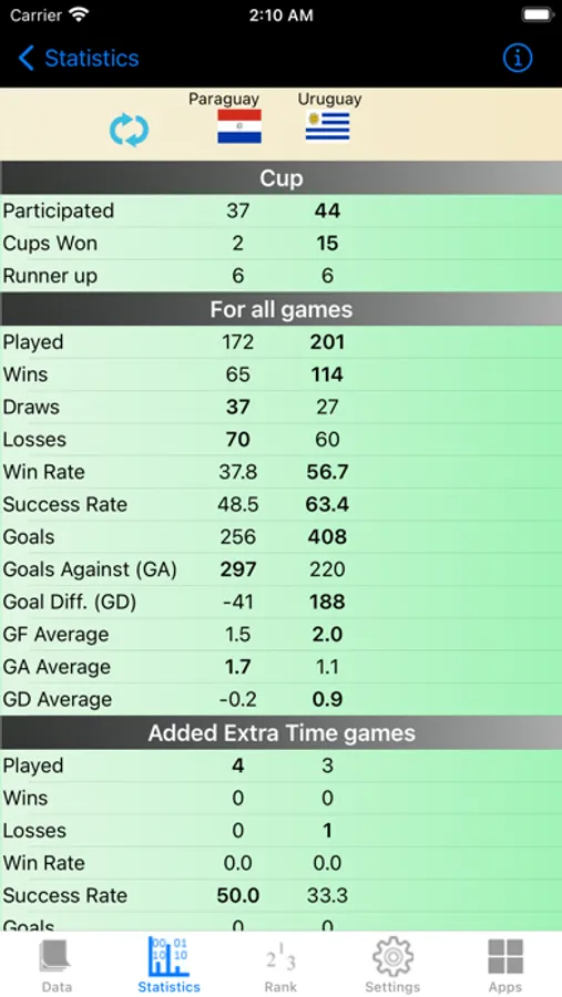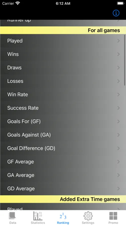 Some of the stats presented in various sections of the app are standard Football stats like Wins, Draws, Losses, Goals For, Goals Against etc. This app also has many uncommon but interesting ones like