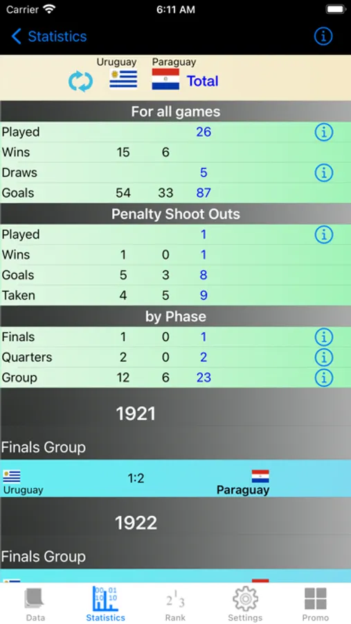 * Head to Head record of any 2 countries
