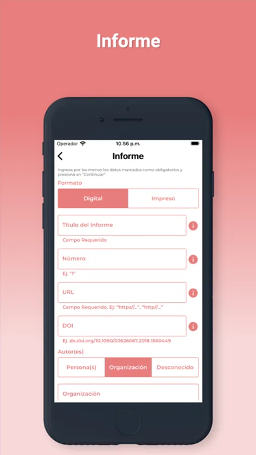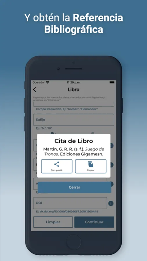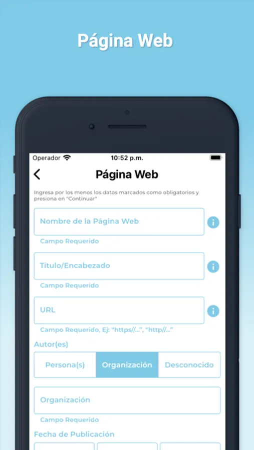 Con APPA Pro podrás hacer citas y referencias bibliográficas para tus trabajos escolares, tesis, investigaciones científicas, etc., solo debes de llenar un pequeño formulario con los datos de la fuente que quieres citar y tocar el botón de continuar.