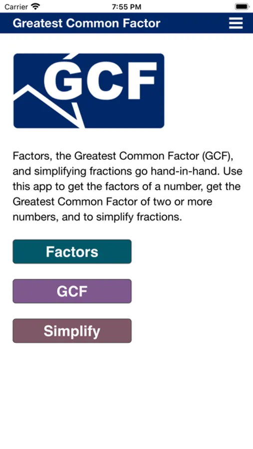 Factors, the Greatest Common Factor, and simplifying fractions go hand-in-hand. Use this app to get the factors of a number, get the Greatest Common Factor of two or more numbers, and to simplify fractions.