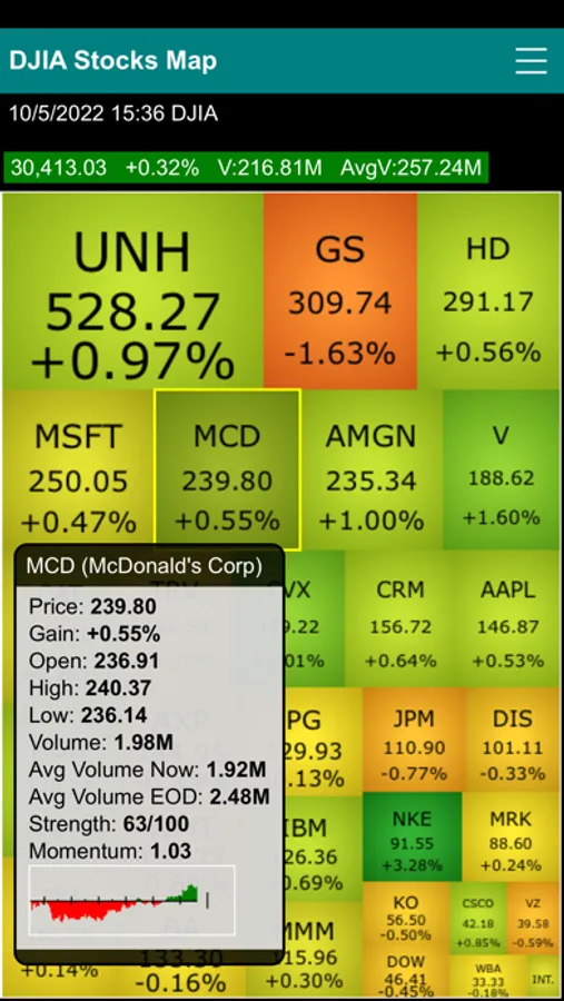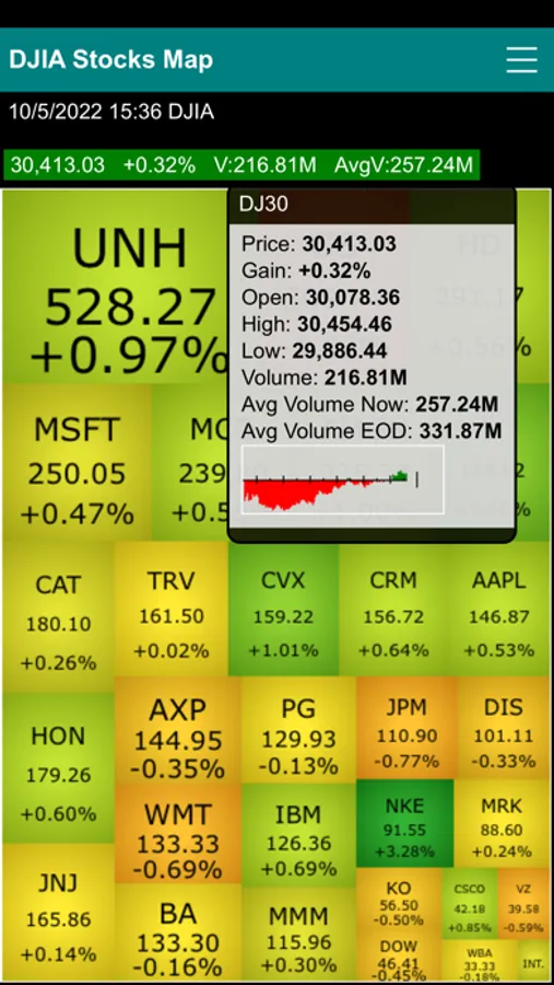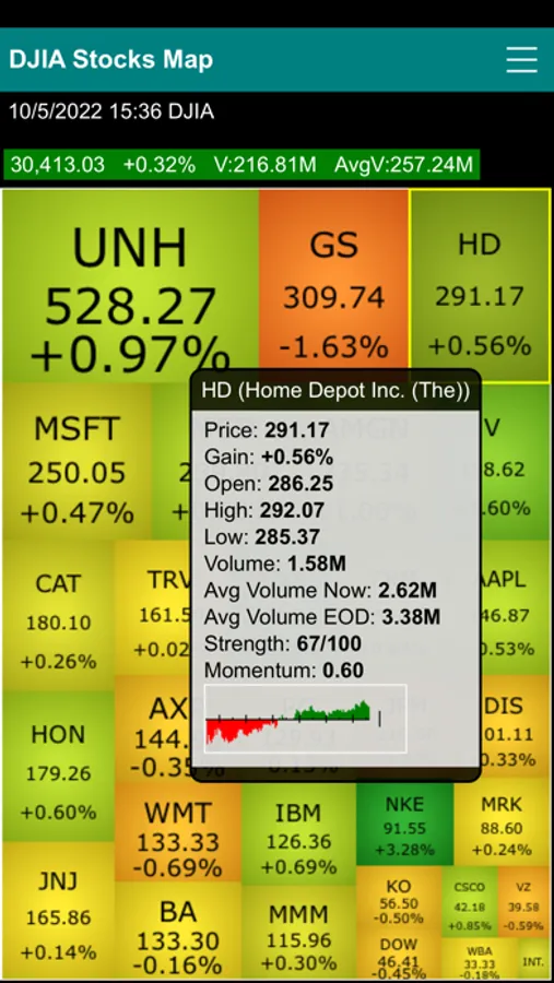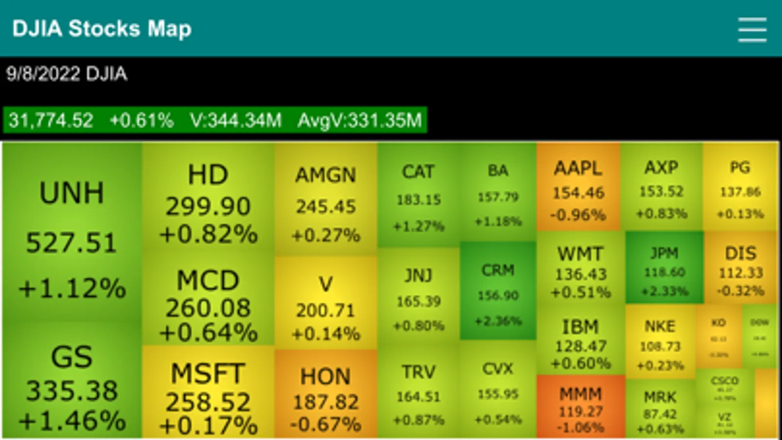 Tapping a block brings up a popup box showing the name, daily closing price, daily gain, daily volume and the 13 week average volume of the stock. The name of each component is labeled on top of each block. Market data are updated every minute.