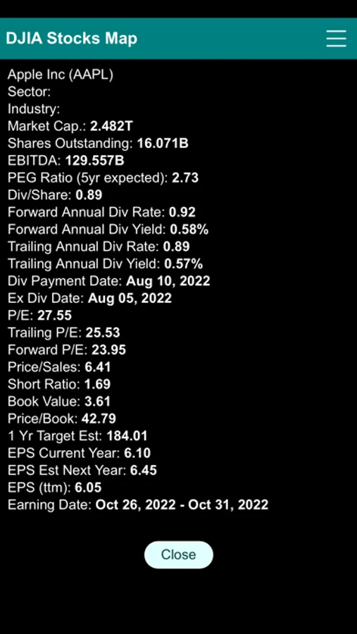 Double tap a stock shows company fundamental data when double tap on a stock map. The fundamental data include Market capitalization, outstanding shares, EBITDA, PEG Ratio, Dividend per share, forward and trailing dividend rate and yield, dividend payout date, ex div date, P/E, trailing and forward PE, price/sales, short ratio, book value, price/book, price target, current and forward EPS, EPS report date, EPS ttm, Basic EPA, Diluted EPS, High/Low EPS estimation, number of analysts.
