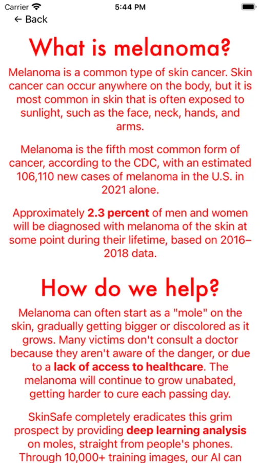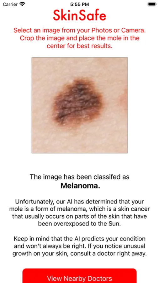 SkinSafe completely eradicates this grim prospect by providing deep learning analysis on moles, straight from people's phones. Through 10,000+ training images, our AI can detect the presence of melanoma without the need of a doctor.