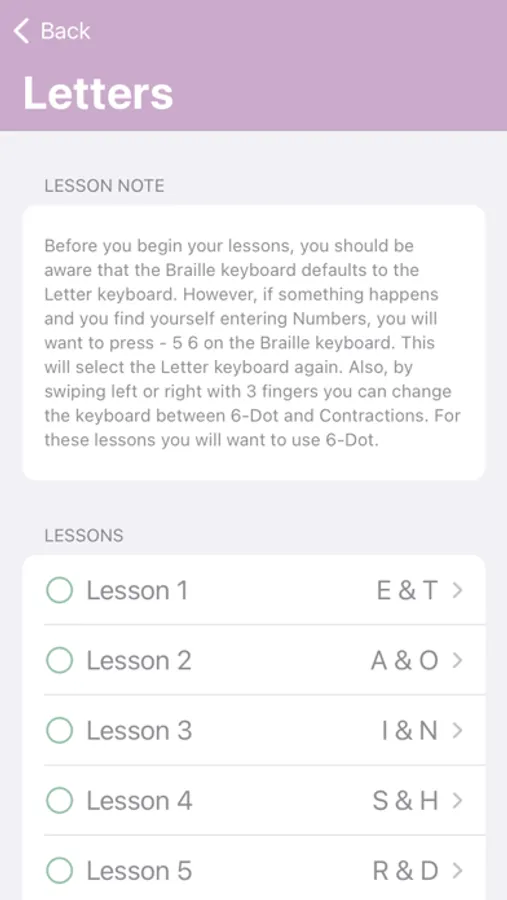Whether you are blind, low vision, or just looking to learn something new, this app starts you from the beginning, and progressively teaches you Letters, Punctuation, and Numbers.