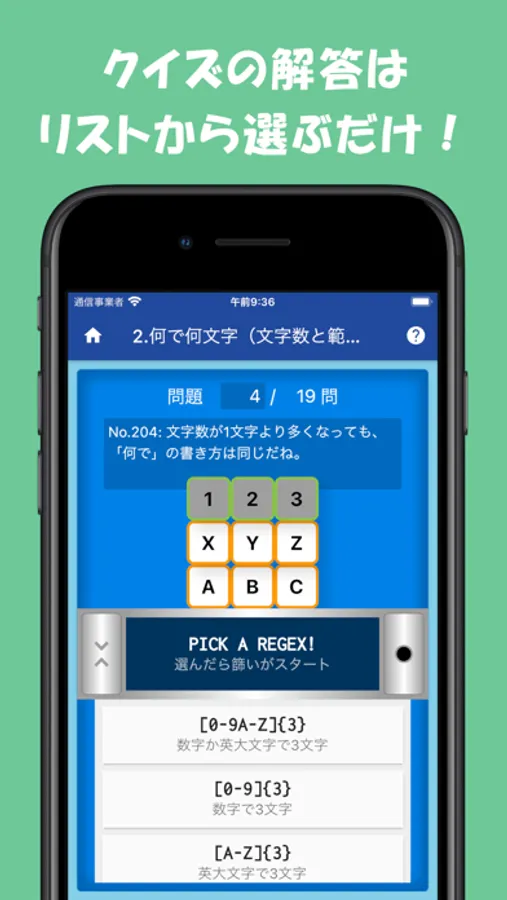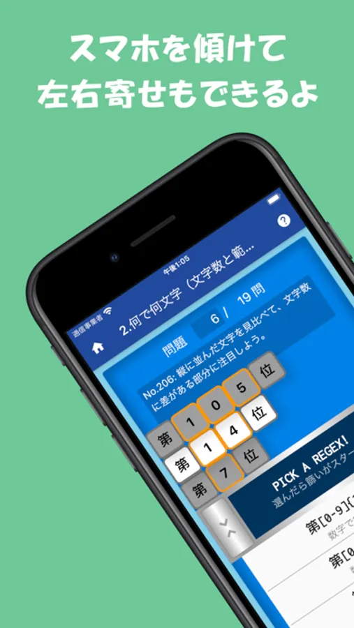 正規表現の篩(ふるい)で、うまく文字をふるい分けられるかな?正規表現を「篩の網目」に見立てた画面で、よく使う正規表現の記述をしっかりと記憶に定着させましょう。基本的なレベルの簡単な問題から、わざと捻った問題もあります。1から順に知識を整理しながら解いていっても良し、自信のある方はランダムに10問出題するメニューもあります。正規表現に興味はあるけれど勉強はこれからという方や、まだまだ理解ができてないなぁと感じる方には、基本から学習できるサイトも紹介しています。このアプリをきっかけにして是非とも正規表現を気軽に使えるようになっていただきたいと思います。