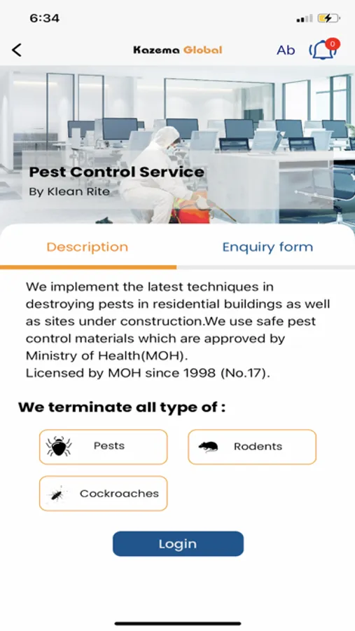 An existing user with valid contracts will able to view their contract details, expiry dates, pending invoices, request for air-conditioning services, preventive maintenance, and cleaning services from Klean Rite. Kazema Services Mobile App will notify you the scheduling details and regular follow up notifications will keep you updated on the progress of service that has been requested.