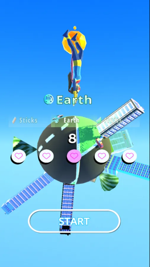 Earth Stage: Hit the vegetables or buildings into the sphere ground. Sometimes you can demolish the buildings.