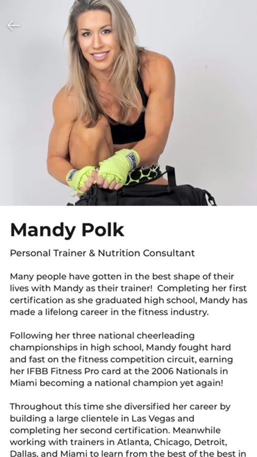 * Nutrition Plans and Logging - Work with Mandy Polk to get the best-customized experience, a customized diet plan, and log your nutrition right on the app! Whether it’s from the prescribed diet, a mindful substitution, an on-the-go scenario, or a cheat/treat, you and your trainer will always be on the same page.