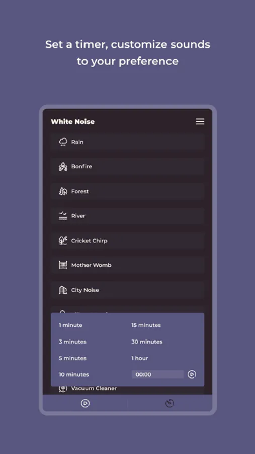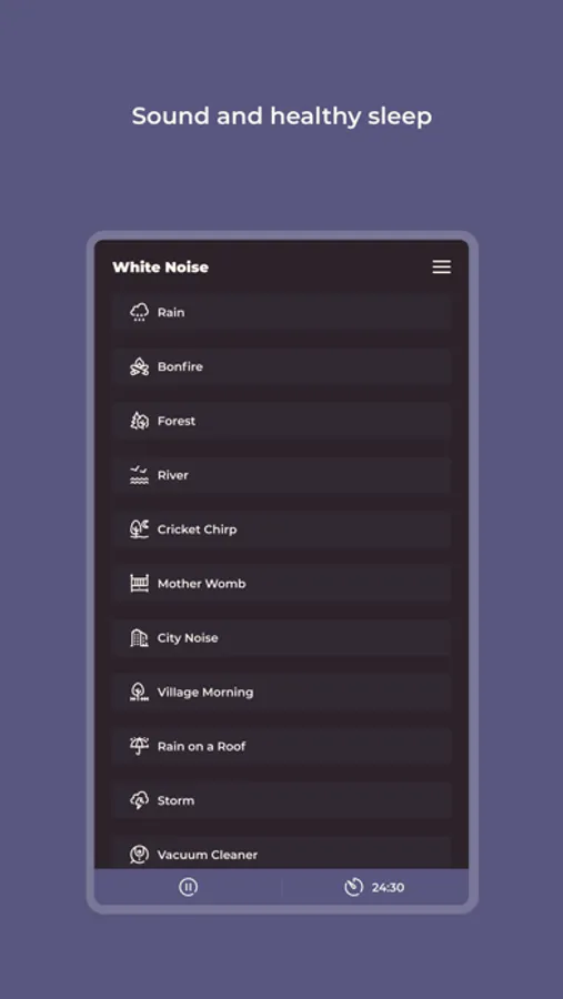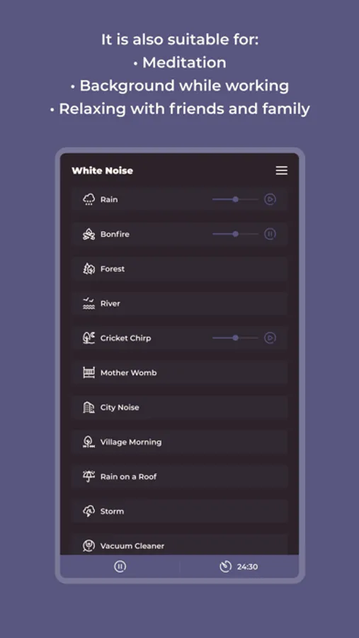 - Nature ambient sounds: rain, thunderstorm, fire, forest, river, mother's womb, crickets