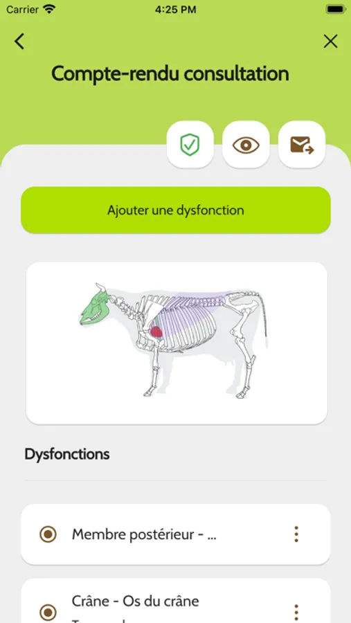 Vous énumérez les dysfonctions ostéopathiques relevées lors de la consultation et un schéma interactif présente avec clarté les articulations, organes ou muscles concernés. Grâce aux menus déroulants, l’édition est très rapide. Vous disposez également d’un espace pour ajouter des éventuels commentaires et vos conseils de rééducation. Vous avez la possibilité de partager immédiatement ce compte-rendu au propriétaire de l’animal.