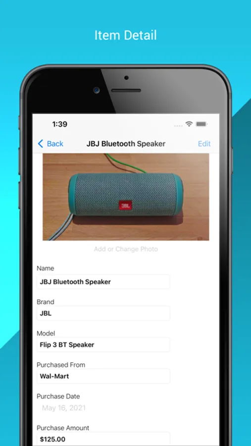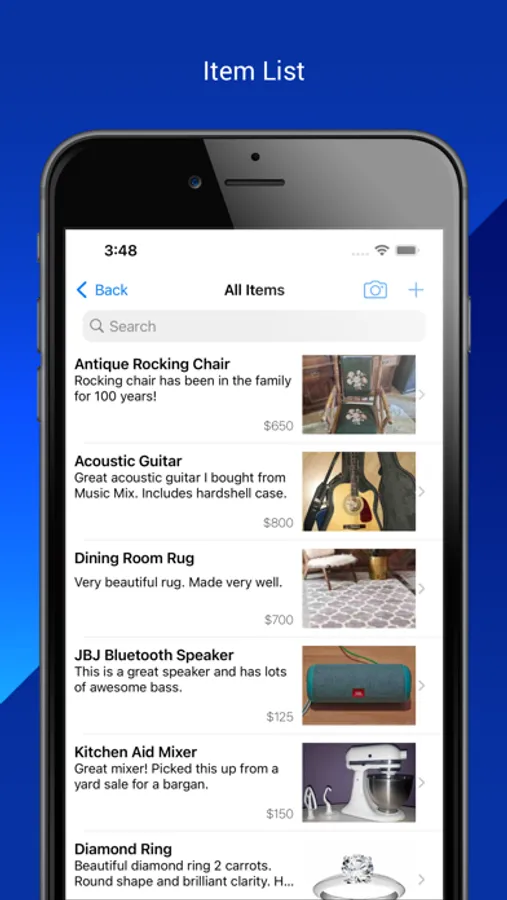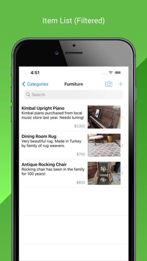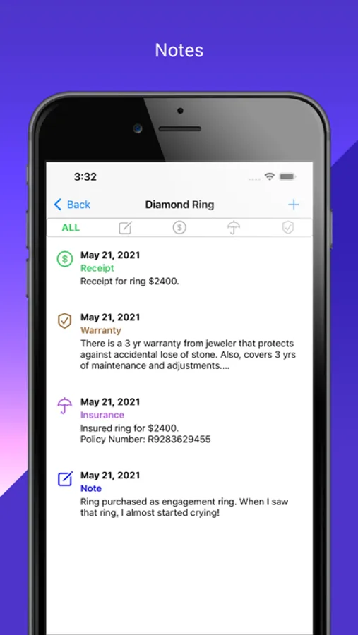 Kabootle allows you to save an unlimited number of photos and notes per inventory item. Photos can be taken using your phone as well as imported from your phone's Photo Library. Each inventory item has its own "photo gallery”. Notes are assigned a 'Note Type' such as Note, Insurance, Warranty, and Receipt, and can be filtered by these types.