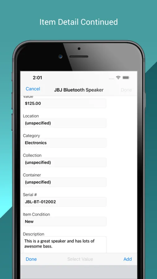 Kabootle allows you to store an unlimited number of home inventory records. Manage all your collections and inventory data in one place. Best of all, Kabootle makes adding your items easy and straight forward. Kabootle tracks the following data elements: Item Name, Brand, Model, Purchase Date, Purchased From, Purchased Amount, Current Value, Location, Category, Collection, Container, Serial Number, Condition, Summary Description. as well as Notes and Photos!