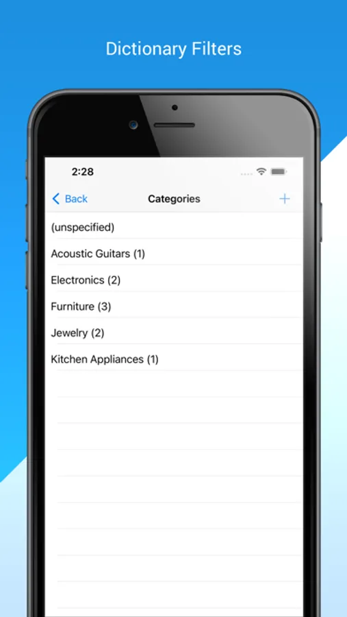 Kabootle comes with several dictionaries that are used as filters. Using these filters to narrow down your item selection making it easy to manage your inventory.