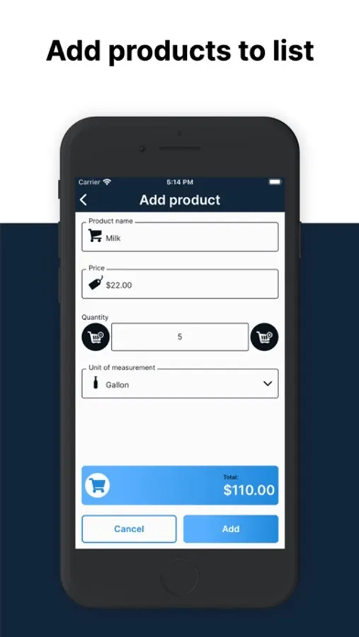 Then you can add all the products that you are going to buy or as you take them from the supermarket. You must assign at least a name to each product. You can also put the price and quantity of products taken and the total will be automatically calculated. You can modify the information of the lists that appear on the main screen, as well as modify prices, quantities, names of products and eliminate them from the list.
