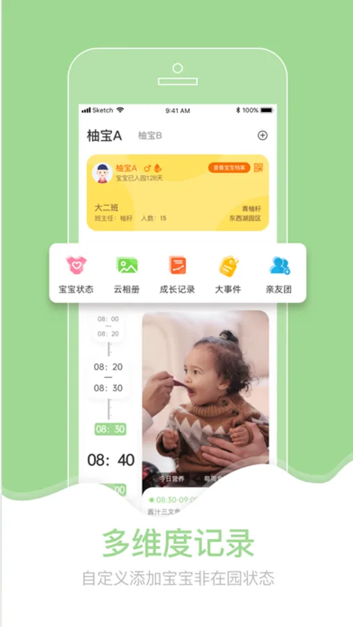 【产品特点】1、家长可随时随地轻松查看宝宝在园状态,知晓感受宝宝在园所学所食所玩;