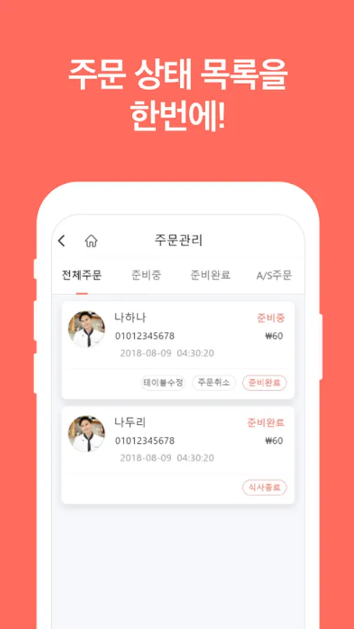 - 주문관리 : 오프라인 매장에 방문하여 주문한 상품에 대한 주문 관리 기능