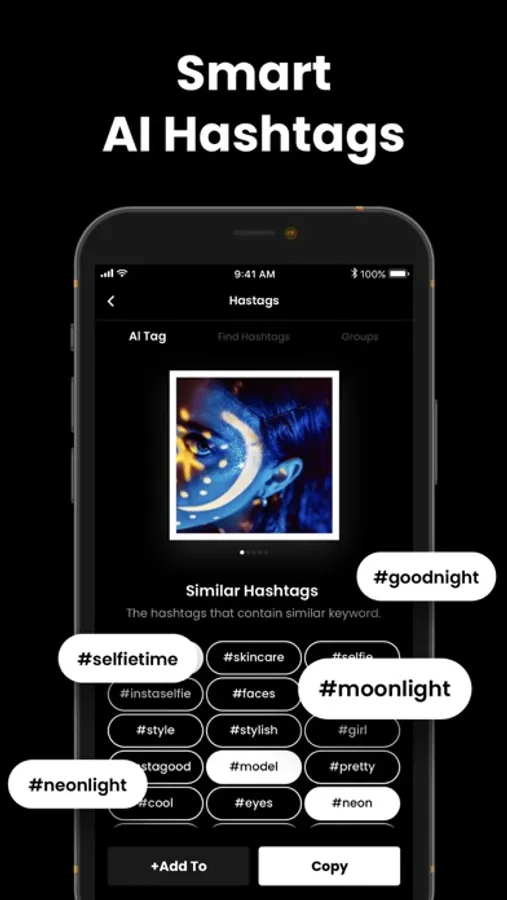 Search keywords to get a group of related hashtags for your post efficiently. Or you can simply upload a picture and generate AI tags based on the elements in your picture. Don’t worry about finding out effective hashtags one by one any longer.