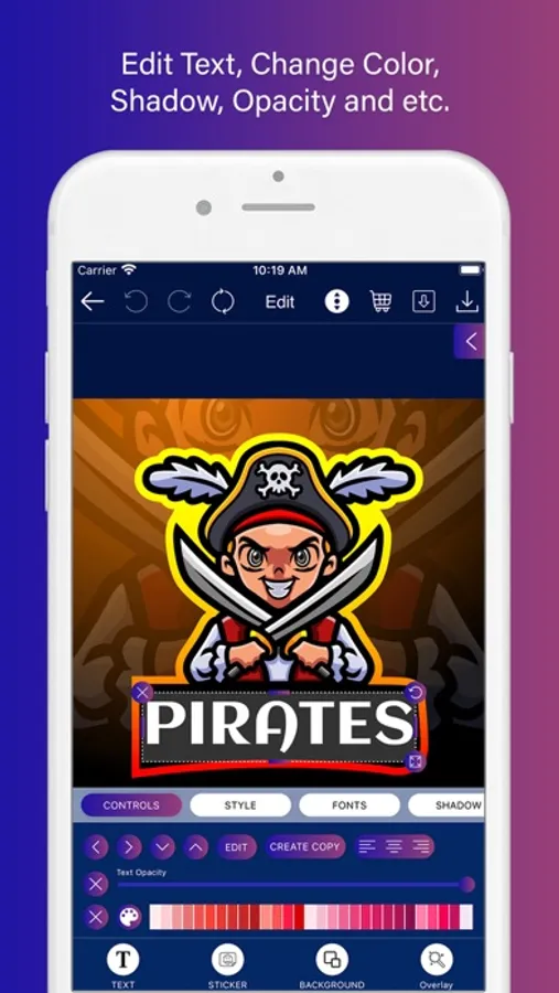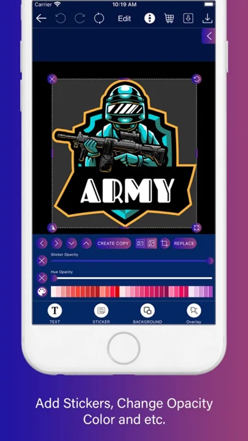 Logo Esport Maker app has easy to use options for the users to edit template like add text, stickers, change color, border, move text or sticker around the logo area and etc.