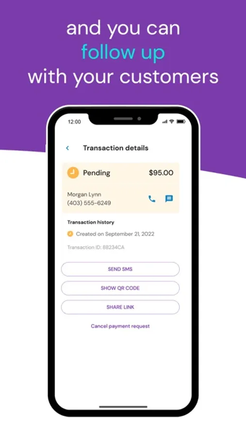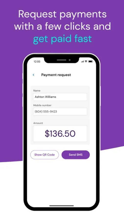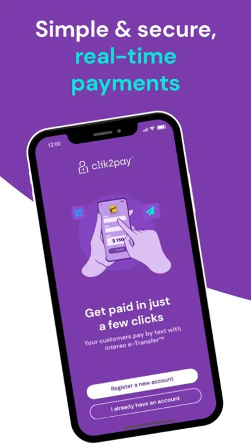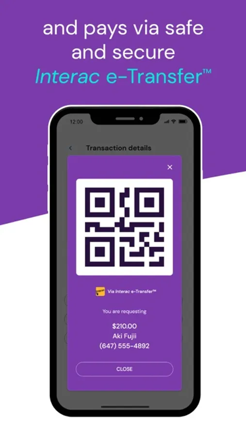 To send a payment request, simply enter your customer’s name, mobile number, and the amount owed into the Clik2pay app. Next, send your payment request via text, or if your customer is with you, display the QR code. Your customer simply clicks the link, selects their bank and logs in, and pays via Interac e-Transfer™. Payment is complete! No hardware needed. No chargebacks.